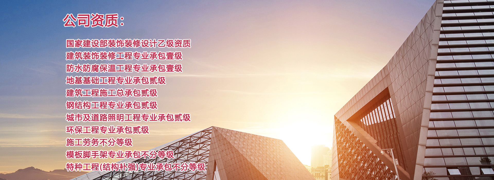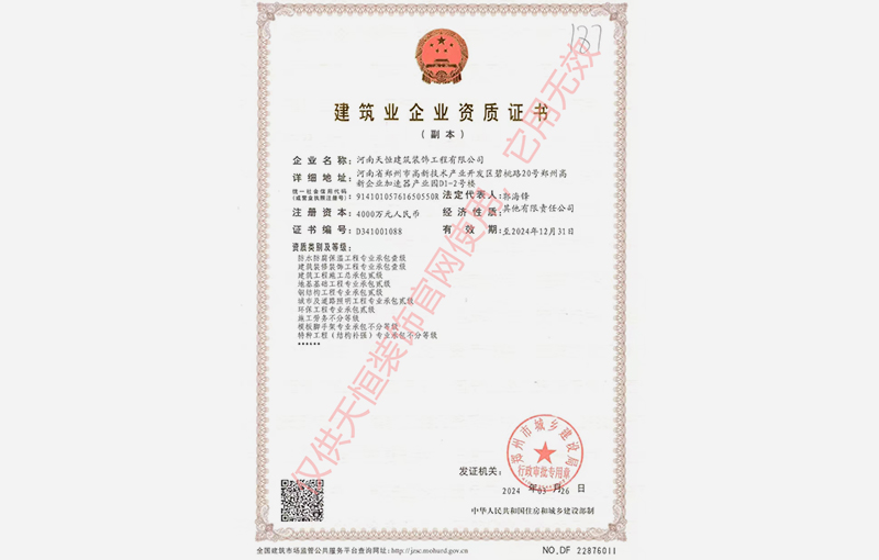 河南天恒建筑裝飾工程有限公司成立于2004年,注冊資金4000萬元,擁有正規(guī)的建筑裝飾工程設計專項乙級、建筑裝修裝飾工程專業(yè)承包壹級、防水防腐保溫工程專業(yè)承包壹級、地基基礎工程專業(yè)承包貳級、建筑工程施工總承包貳級、鋼結(jié)構(gòu)工程專業(yè)承包貳級、城市及道路照明工程專業(yè)承包貳級、環(huán)保工程專業(yè)承包貳級等多個建筑業(yè)企業(yè)資質(zhì)。
